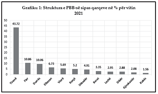 Në strukturën e PBB-së, vendin e parë me 43.72 për qind e mban qarku i Tiranës, i larguar ndjeshëm nga qarqet e tjera. Në vendin e dytë renditet qarku i Fierit me 10.86 për qind, që pasohet shumë ngushtë nga qarku i Durrësit me 10.06 për qind. Më pas vijnë: qarku i Elbasanit 6.73 për qind, i Vlorës 5.69 për qind, i Korçës 5.20 për qind, i Shkodrës 4.91 për qind, i Beratit 3.35 për qind, i Dibrës 2.88 për qind, i Gjirokastrës 2.08 për qind. Renditja mbyllet nga qarku i Kukësit me 1.56 për qind.