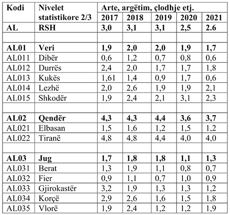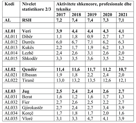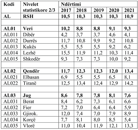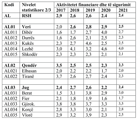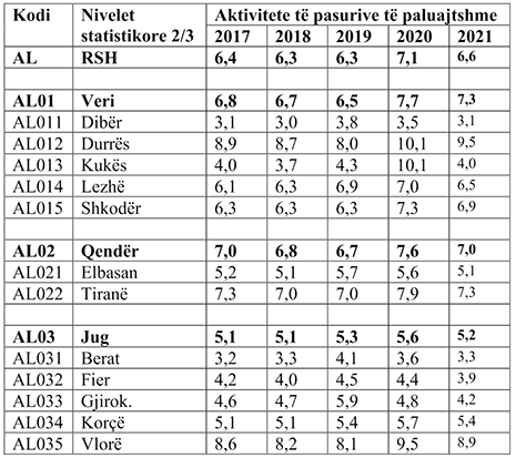 së aktivitetit, tregues më të lartë janë shënuar në rajonin statistikor Qendër dhe sidomos në qarkun Tiranë, që ka arritur në 4.8 për qind në vitet 2017 dhe 2018 dhe ka rënë në 4 për qind në vitet 2020 e 2021, që pjesërisht është pasojë e masave kufizuese të vendosura gjatë pandemisë së Covid 19.