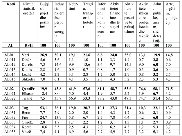 VSHB e aktiviteteve shkencore, profesionale dhe teknike përfaqësohet nga rajoni Qendër me 76.5 për qind, pasuar nga rajoni Veri me 13.1 për qind dhe rajoni Jug me 10.3 për qind. VSHB e degës së administratës publike, arsimit, shëndetësisë etj. përfaqësohet me 58 për qind nga rajoni Qendër, pasuar nga rajoni Jug me 22.1 për qind dhe rajoni Veri me 19.9 për qind. VSHB e degës së arteve, argëtimit, çlodhjes përfaqësohet nga rajoni Qendër me 71.5 për qind, pasuar nga rajoni Veri me 14.8 për qind dhe rajoni Jug me 13.7 për qind.