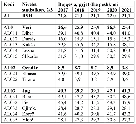 Nivel më i lartë është shënuar në qarkun e Veriut, nga 15.6 për qind më 2020 në 18 për qind më 2019 e 2020 dhe 17.4 për qind më 2021.