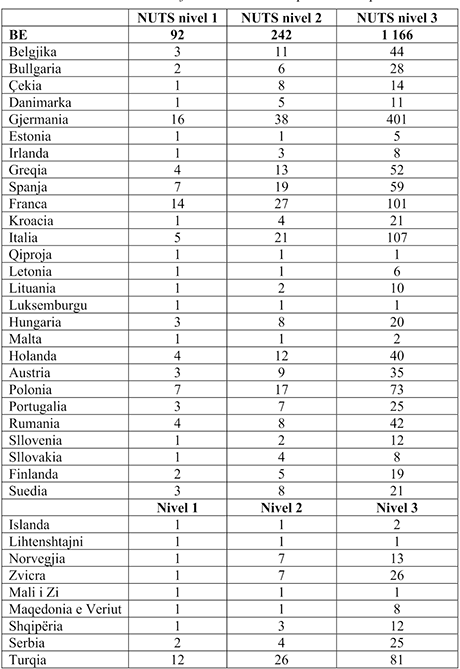 Tabela 1 përmban numrin e rajoneve për secilin vend anëtar të BEsë dhe jo anëtar të përfshirë në vjetarin rajonal të Eurostat-it. Klasifikimi NUTS ka pësuar ndryshime në vite, të cilat prej 1 janarit 2024 paraqiten në vijim. Sipas kësaj tabele, NUTS përfshin 92 rajone në nivelin NUTS 1, 244 rajone në nivelin NUTS 2 dhe 1 165 rajone në nivelin NUTS 3.2)