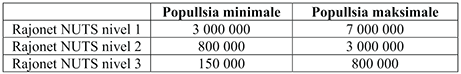 Parimi 1: NUTS përcakton kufijtë minimum dhe maksimum për adhësinë e rajoneve individuale NUTS (Tabela 2) për të siguruar një hkallë bazike të krahasueshmërisë. Luhatjet nga këta kufij janë të undshme vetëm kur ekzistojnë kushte gjeografike, socio-ekonomike, istorike, kulturore apo jedisore.