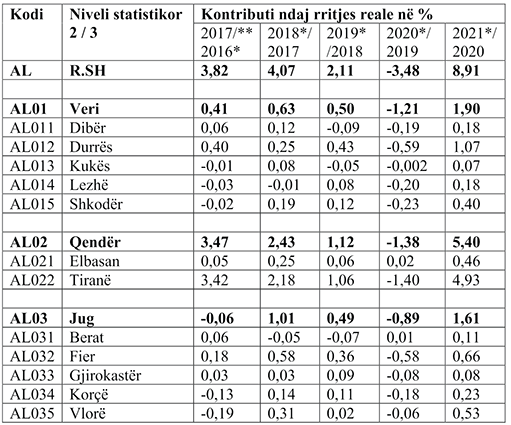 Referuar vitit 2021, rritja mesatare në shkallë vendi është vlerësuar 8.91 për qind, rajoni Veri ka kontribuar me 1.90 për qind, rajoni Qendër 5.40 për qind, që shpreh edhe peshën më të madhe të kontributit në shkallë vendi dhe rajoni Jug 1.61 për qind. Nga këto të dhëna del se rajoni Qendër