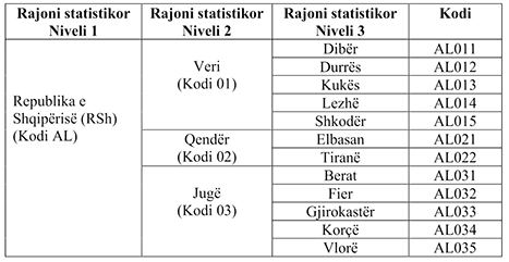 Më 28 prill 2011 EUROSTAT-i konfirmoi propozimin e INSTAT-it të iratuar nga Këshilli i Ministrave në dhjetor 2010 për ndarjen e vendit në rajone statistikore: niveli 1-Shqipëria (Kodi AL), niveli 2 –Veri, Qendër, ug (Kodi 01,02,03) dhe niveli 3, që përfaqëson 12 qarqet e vendit (Tabela 3)6)