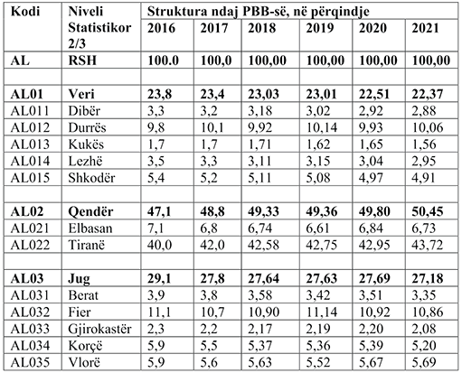 Niveli më i lartë i PBB me çmime korrente gjatë kësaj periudhe është shënuar në rajonin Qendër në vitin 2021, ku arriti në 936.419 milionë lekë ose 50.5 për qind e nivelit në shkallë vendi, rreth 2.3 herë më shumë se në rajonin e Veriut dhe 85.6 për qind më shumë kundrejt rajonit të Jugut.12)