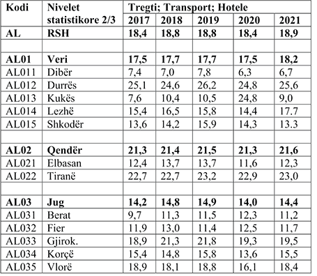 VSHB në tregti, transport dhe hotele në vitet 2017-2021 ka zënë një peshë të rëndësishme në VSHB gjithsej që fillon nga 18.4 për qind më 2017 në 18.9 për qind më 2021. Nivelet më të larta janë shënuar në rajonin Qendër, nga 21.3 për qind më 2017 në 21.6 për qind më 2021. Sigurisht që kontributin më të madh e jep qarku i Tiranës, ndërkohë që qarku i Elbasanit paraqitet në shifra modeste. Pas rajonit Qendër renditet rajoni Veri me 17.5 deri 18.2 për qind të VSHB në tregti, transport dhe hotele. Këtë mesatare e ngre qarkui Durrësit, që paraqitet me nivele 25-26 për qind. Më pas renditen qarku i Lezhës dhe i Shkodrës, të cilat, si dhe Durrësi, kanë një pjesë të vijës bregdetare të detit Adriatik.