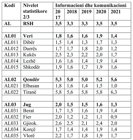 Vlera e shtuar bruto në informacion dhe komunikacion, siç mund tëkuptohet, për vetë natyrën e veprimtarisë së kësaj dege, ndikon fare pak në VSHB në shkallë vendi. Si dhe në aktivitete të tjera, edhe në këtë rast peshën më të madhe e jep rajoni i Qendrës dhe sidomos qarku Tiranë, me 6.3 për qind më 2021.