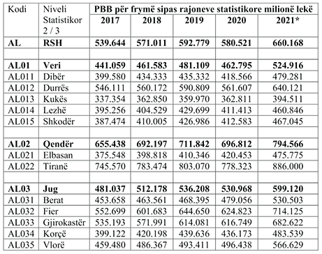 Treguesi i PBB-së për frymë sipas rajoneve statistikore ka shënuar rritje prej 22 për qind më 2021 kundrejt vitit 2017. Nivele më të larta të këtij treguesi janë shënuar në rajonin Qendër. Niveli i vitit 2021 në këtë rajon është 20.4 për qind më i lartë se më 2017. Brenda këtij rajoni, niveli më i lartë është arritur në qarkun e Tiranës 31.2 për qind. Pas rajonit Qendër vjen rajoni Jug, pasuar nga rajoni Veri.