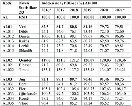 PBB për frymë sipas rajoneve - indeksi ndaj PBB-së (%) Al=100paraqitet më i lartë në rajonin Qendër, me 120.36 % më 2021. Në nivel qarqesh, tregues më të lartë të indeksit janë shënuar në qarkun e Tiranës 134.21 %, Fier 108.17 %, Gjirokastër 103.40 % etj.