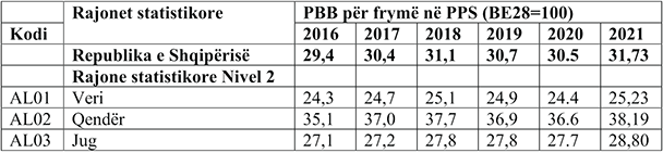 Nga viti 2011, bazuar në kriteret metodologjike të institucioneve të BE-së, krahas treguesve në shkallë vendi, INSTAT-Albania publikon llogaritë statistikore rajonale. Në vitin 2021 ndaj vitit 2016 PBB në shkallë vendi është rritur 26 %, PBB i rajonit Veri 18.5 %, rajoni Qendër 35 % dhe rajoni i Jugut 17.7 %. Niveli më i lartë i PBB me çmime korrente gjatë kësaj periudhe është shënuar në rajonin Qendër në vitin 2021, ku arriti 50.5 për qind e nivelit në shkallë vendi, rreth 2.3 herë më shumë se në rajonin e Veriut dhe 85.6 për qind më shumë se rajoni i Jugut. Qarku i Tiranës ka dhënë 87 për qind të rajonit Qendër, kur qarku Elbasan llogaritet për 13 për qind. PBB për frymë në PPS në raport përqindjeje me BE 27=100, ka shënuar një rritje relativisht të ulët në vitet në studim, nga 29.4 % më 2016 në 32.73 % më 2021. Në raportin mesatar të PBB ndaj BE, peshën më të madhe e jep rajoni Qendër, nga 35.1 % më 2016, në 38.19 % në vitin 2021.