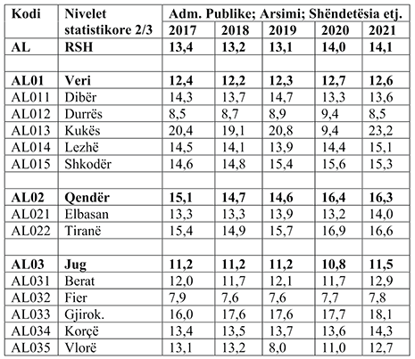 qarku i Durrësit me 18-19 për qind, i Shkodrës me 11.9 për qind më 2020 dhe 16.8 për qind më 2018, qarku i Kukësit nga 13.4 për qind më 2021 në 18.2 për qind më 2020.